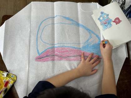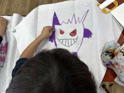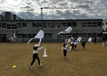 みんなが絵を描いた凧をあげました。今日は風があまりなかったため、走りながら上げましたが、上手に飛んでいました!