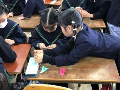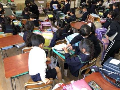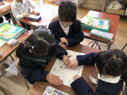 1年生がもろぐち保育園、よこづつみ保育園の年長さんたちと交流しました。始めにランドセルに教科書を入れる学校の準備の練習をしました。そのあと、算数の点つなぎ、タブレットPCを使っての間違い探し、折り紙でぱっちんカメラ作り方をしました。1年生の子たちは歳は1年の違いですがしっかりお兄さんお姉さんとして優しく声をかけながら教えていました。年長さんもあと2か月ほどで小学生です。今日の経験で小学校に来るのが楽しみに思ってくれたらうれしいです。入学を待っています。