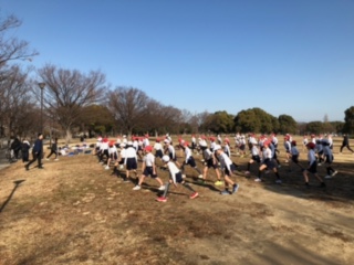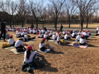 4年生が鶴見緑地でマラソン大会に来ています。準備体操をしてコース説明を聞いています。