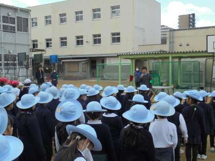 今日は不審者が授業中に学校に侵入した想定で防犯の避難訓練を行いました。不審者が侵入した合図の放送が入ると、運動場で体育をしていた学年はすぐ校舎内へ、また教室にいた学年は室内で侵入を防ぐ対策をして静かに待機しました。今日は鶴見警察の方に協力をいただき、不審者役で校内を徘徊していただきました。万が一の時にとるべき行動がイメージできたのではないかと思います。