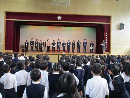 今日から令和7年度がスタートしました。子どもたちは新しい校舎に少し戸惑いながらも、元気に登校してきてくれました。始業式では新しく着任した教職員が紹介されました。今年度は校長先生を含め18名が新しく着任しました。始業式の中で校長先生からはやる気、本気、元気の3つの木(気)を大切にという話がありました。始業式の後は担任発表でした。みんなドキドキしながら校長先生の発表を聞いていました。新しい学年で精いっぱいがんばってほしいと思います。