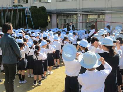 運動場での初めての児童朝会