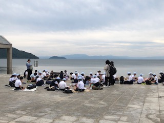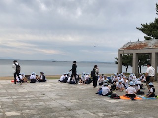 琵琶湖畔でみんなでお弁当を食べています。みんな元気です!