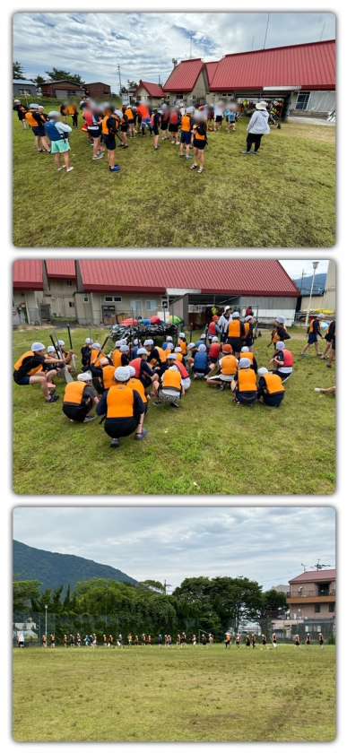 いかだ作り班の子どもたちは、説明を聞いて、まずはライフジャケットを着ました。