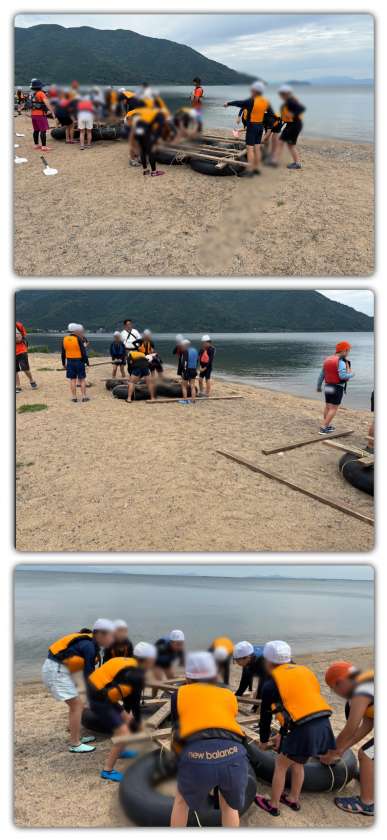 声をかけ合って、組み立て方を考えて、いかだを作っていきました。