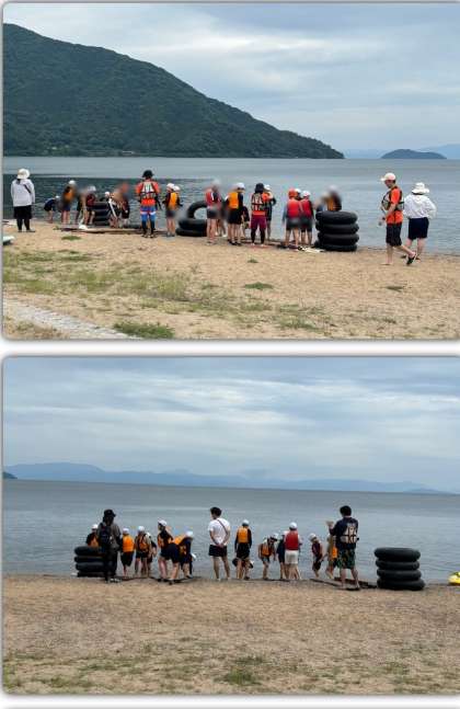 戻ってくる時も掛け声を出して、ゆっくりと戻ってきました。戻る途中、バランスを崩して、湖にはまる児童もいましたが、いかだの上の児童が手を差し伸べて上に戻ることができ、みんな笑顔で浜まで戻ってきました。