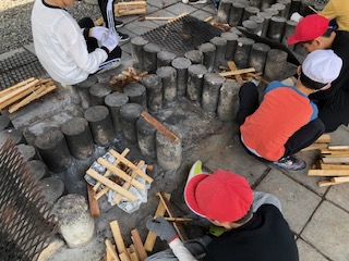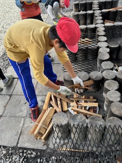 かまと係は火をおこすため、薪の組み立てをがんばっています。