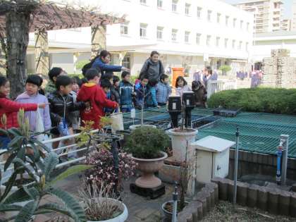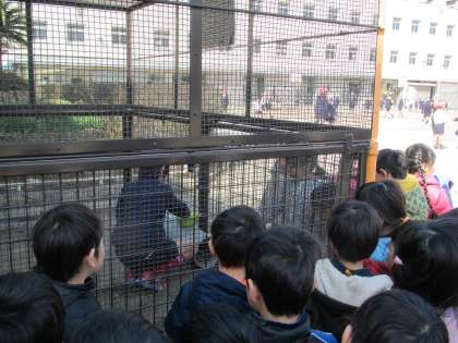 池のコイを覗き込んだり、ウサギを見たり、1年の教室で交流したりしました。