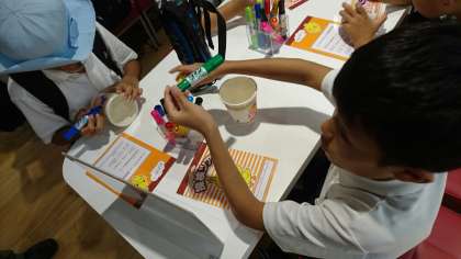 午後からはインスタントラーメン博物館です。みんな、自分好みのカップラーメンを作成中です。