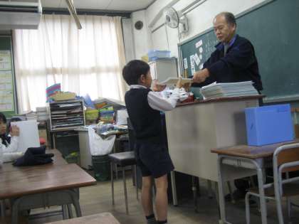 今日は2学期最後の日、終業式です。みんな、学習の記録をそれぞれの担任の先生から手渡され、少し緊張しながら見ていました。お家でも、2学期を振り返り、3学期のこと、これからのことをお話してあげてください。