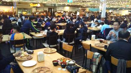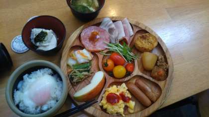 朝、早く起きて仕事をした後、朝食の時間です。ビュッフェ形式で野菜や果物、ハムやウィンナーなど種類もたくさんあります。どれを食べようか、目移りします。