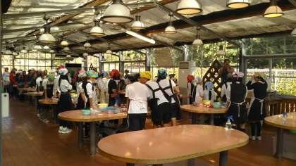 これから、活動班に分かれて、お楽しみの体験学習が始まります。ウィンナー作りとパン作りに分かれて活動します。おいしいものが作れるといいですね。