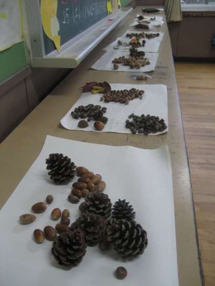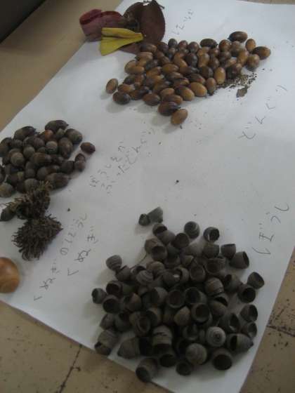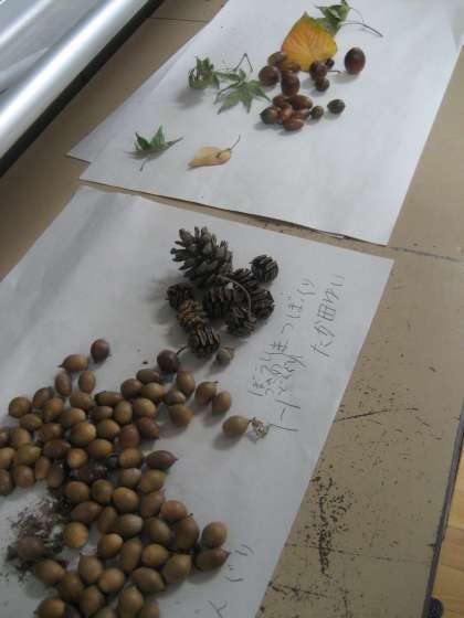 一年生の教室の後ろに生活科の学習『たのしいあきいっぱい』でみんなが学習したどんぐりや落ち葉が並べられています。秋真っ盛りの学習を、子どもたちは楽しんでいたようです!