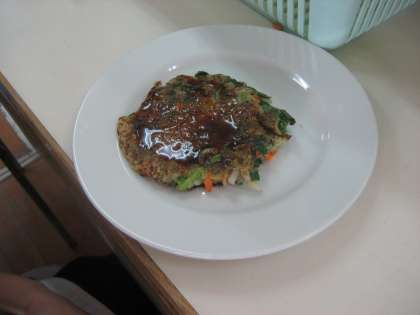 今回は、「チヂミ」を作りました。にら、もやし、にんじんを入れてきつね色にこんがり焼いていました。もちもちした食感で美味しかったようです。
