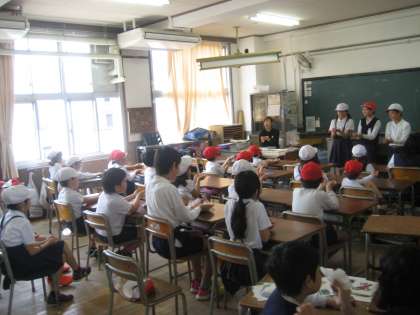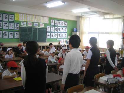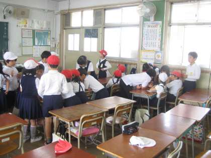 わくわく班とはは1年から6年までの縦割りで作る班です。今日は顔合わせと班名簿を作りました。残りの時間は仲良くなれるように、リーダーさんが中心になって「落ちた落ちた」のゲームをしてくれました。