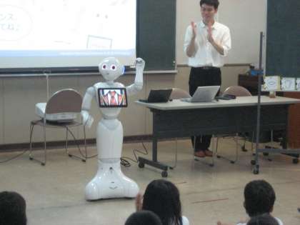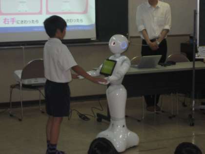 5年生でICT出前授業がありました。あの有名な人型ロボット「ペッパー」がやってきました。1時間目はペッパーの得意なダンスを見せてもらったり、ペッパーと会話やクイズをしたりして、ペッパーはどんなことができるの?ということを教えていただきました。子どもたちはみんな興味津々。笑いもあり、ペッパーの応答や動作に大喜びで楽しくペッパーについて知ることができました。