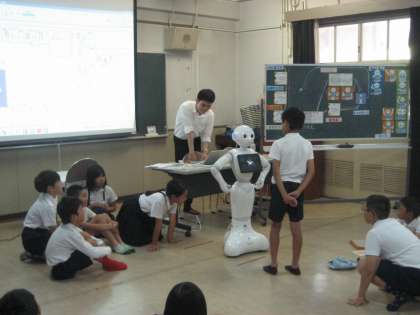 2、3時間目はプログラミングをして班ごとにペッパーを動かしてみました。はじめに基本的なプログラミングの仕方を教わり、ペッパーが会話したり、動いた利する仕組みを知りました。そのあと「ペッパーのパン屋さんのおすすめのパンを紹介しよう」というテーマでペッパーに2種類のおすすめパンを紹介させるプログラムを班で考えました。そして実際にそのプログラムでペッパーが動くかを発表しました。やや難しかったのですが、子どもたちはしっかり考えて自分たちのしたいことをプログラミングして、見事にペッパーを動かすことができました。あっという間の3時間でしたが、ペッパーとともにプログラミングの面白さを体験できました。