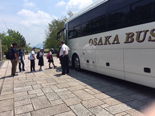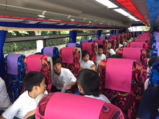 お弁当はほとんどの子が完食でした。さあ、バスに乗っていざ宿舎のマキノパークホテルに出発です。バスの中ではバスレク係が企画したゲームを楽しんでいます。