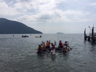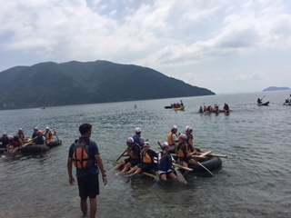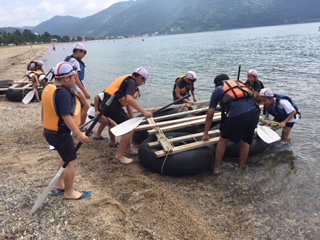 イカダができたらいざ琵琶湖に漕ぎだします。意外と丈夫にできています。気持ちよさそうです。