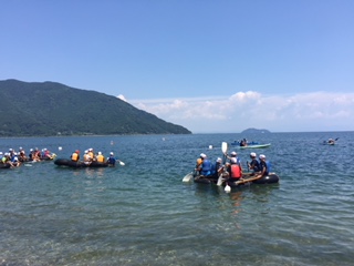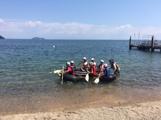 1組のいかだが完成して琵琶湖に発進していきました。力を合わせて漕いでいます。イカダレースもしました。