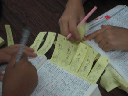 授業では3年生と4年生が、知っている言葉から辞書を引いていき、番号をつけた付箋を辞書に貼っていくことを教えていただきました。子どもたちは集中して辞書を引き、短時間でたくさんの付箋をつけていきました。