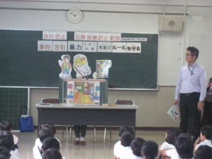 中央サポートセンターの方に来ていただき非行防止教室を行いました。高学年が巻き込まれそうな非行。その中でも万引きは窃盗にあたる犯罪であることをペープサートを使ってお話しいただきました。教えていただいたことを常に思い起こし、心の中に潜む悪い誘惑に負けないようにしていってほしいです。