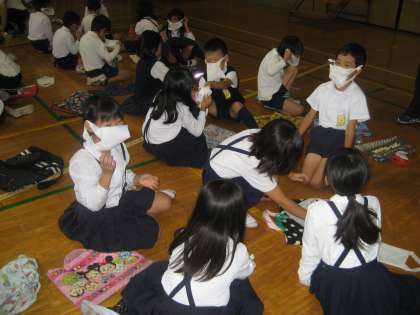 DVDで防災について学習した後1、2年生はスリッパ作りをしました。新聞紙1まいを折っていくことで簡易のスリッパが出来上がりました。