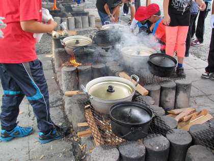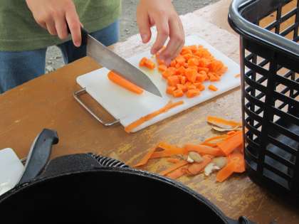 野菜を洗う。材料を切る。米の水加減をする。かまどの火をおこす。
