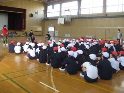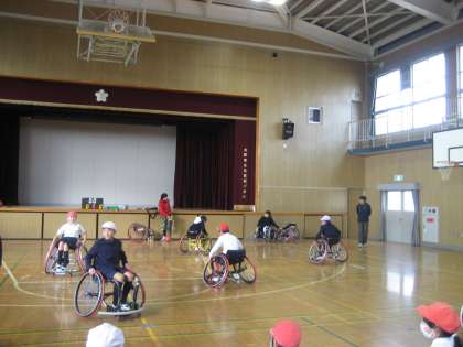今日は、「パラリンピックキャラバン」の方々に来ていただき、車いすバスケットボールについて教えてもらいました。