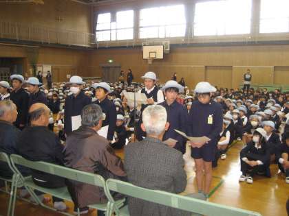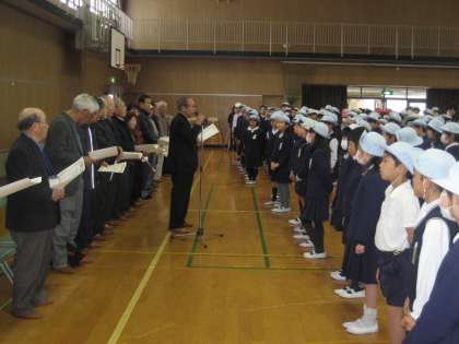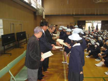 茨田南小学校では地域の方々が登下校を見守ってくださっています。今日はご協力いただいている見守り隊の方々にお越しいただき、感謝状を贈りました。感謝状は6年生が作成し、代表の児童が渡しました。1年間天候にかかわらず、毎日登下校を見守っていただきました。今日来られたのは20名ほどでしたが、もっと多くの方々が茨田南の子たちを見守ってくださっています。おかげで1年間事故にあうこともなく安全に登下校ができました。これからもご協力よろしくお願いします。