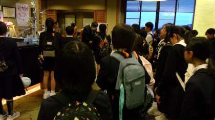 旅館に到着し、たくさんの旅館の方にお出迎えしていただき、開舎式と避難経路を確認して避難訓練を行いました。