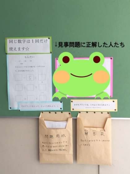 校内の掲示板に算数科の掲示をしています。そこに、茨田北小児童に向けたチャレンジ問題も掲示されています。頭をひねる問題なので、掲示板の前でうーんと考えている姿を見ます。答えがわかった人やもっと考えたい人はプリントを持って帰ってといて解いています。「難しかったけれど、楽しかった。」「解けたら簡単!」!と言っていました。正解者は名前が載ります。名前が載るのは嬉しいようで、自分の名前を眺めていました。
