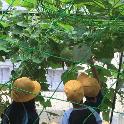 ぐんぐんと成長するひょうたんの実。大きさはいくつかな、さわった様子はどうかなと観察をしました。「中身はどうなっているのだろう。」と児童から疑問が出てきたので、割ってみることになりました。