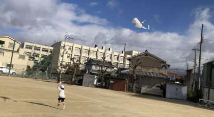 走れば走るほどたこがきれいに広がり、糸をのばすと高く飛ぶことがわかり、各々が工夫しながら大空にたこを揚げていました。