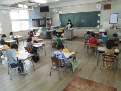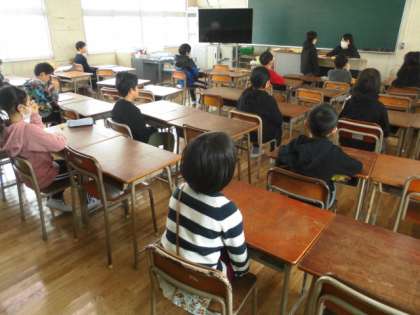 席をそれぞれ離して座り、放送にて校長先生の話を聞きました。