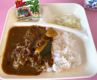 夏が旬のなす、かぼちゃ、トマト、ピーマンを使用した、具だくさんのカレーライスです。彩りも良く、目からも食欲を誘います。