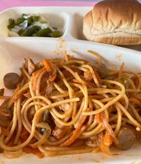 トマトピューレとケチャップでトマト味のスパゲッティです。