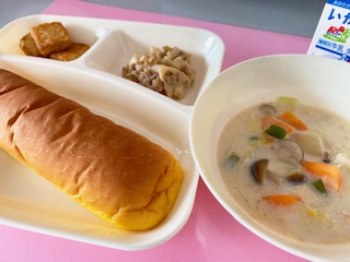 鶏肉、白菜、たまねぎ、にんじん、三度豆、しめじを牛乳とクリームでコトコトと煮て作ります。