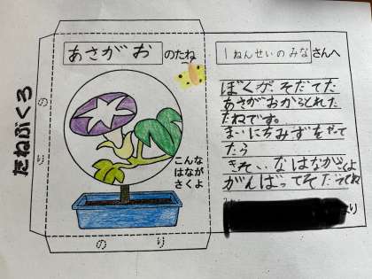 1年生が夏休みに頑張って育てたあさがおの種を入れる