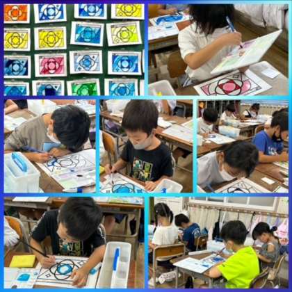 みんなの作品を並べると、ステンドグラスのような素敵な作品が出来上がりました。子どもたちは、教室に作品が飾られると友だちの作品をじっと鑑賞していました。