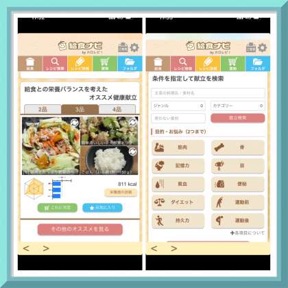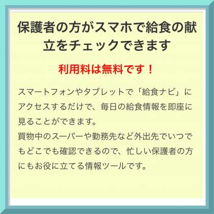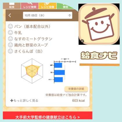 スマホにアプリを登録すると毎日の給食の献立と栄養バランス等を確認できます。