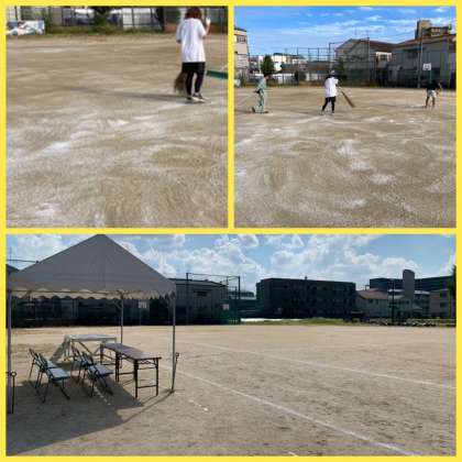 運動会が近いので、子どもたちのために、また近隣住宅への砂の飛散を押さえる目的もあるんです。