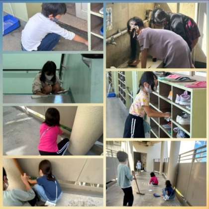 2年生の掃除時間の様子です。掃除開始の音楽と共に、掃除時間が始まります。自分の掃除担当場所をさっと終わらせた後は、いつも掃除できていない箇所を探して掃除をしている子もいます。
