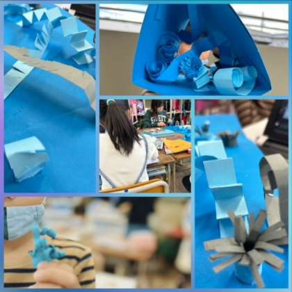 はじめは細長い紙を折ったり、丸めたりする子が多かったですが、友だちの発表を参考にした後は、細長い紙の半分を丸めて、もう半分はギザギザ模様をつけるなど1枚の紙工作で様々な紙の折り方を楽しんでいる子が増えました。