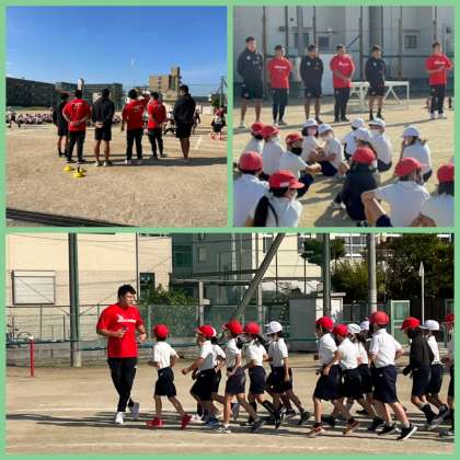 ラグビーボールに触れ、チームづくりゲームやボール回しゲームを楽しんだり、選手たちの迫力のあるパスやタックルを見て興奮していました!!