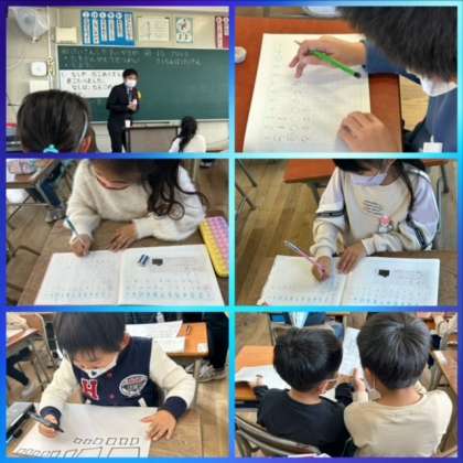 金曜日、1年生の教室では研究授業がありました。教室の後ろや廊下にずらりと先生たちが並び1年生の算数の様子を見つめていました。「あ、お兄ちゃんの担任の先生だ!」「校長先生も見てる!」と、見に来た先生たちのことを見て嬉しそうな様子でした。