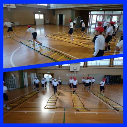 体育の時間、準備運動をかねてラダートレーニングの取り組みを始めました。