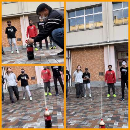 コーラーの中にメントスを入れて噴火させる実験です。