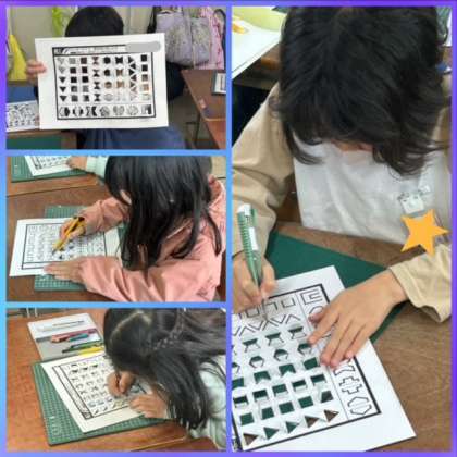 2年生は、図画工作科でカッターナイフをはじめて使って、作品作りをしています。少し怖がりながら丁寧に作品を仕上げていました。