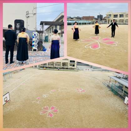 運動場にはおめでとうのアートも!!その中、見送りは、5年生のリコーダー演奏の中、5年、保護者の方、教職員の花道を通り抜け、